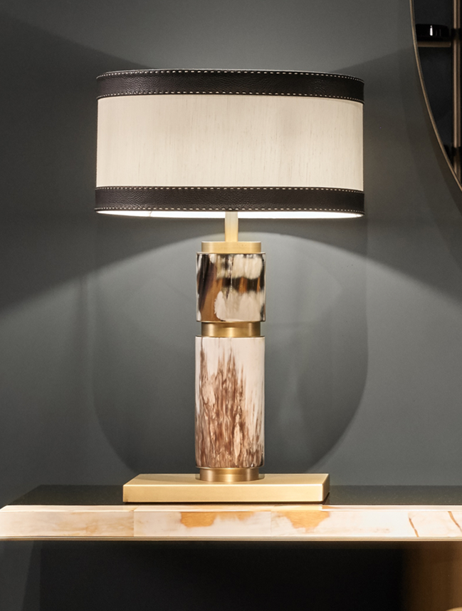 Babel lamp: an elegant satin brass structure enriched with cylindrical inserts in polished horn that create a three-dimensional effect and perspective. The lamp is topped with an ivory shantung lampshade with a Tosca leather border.