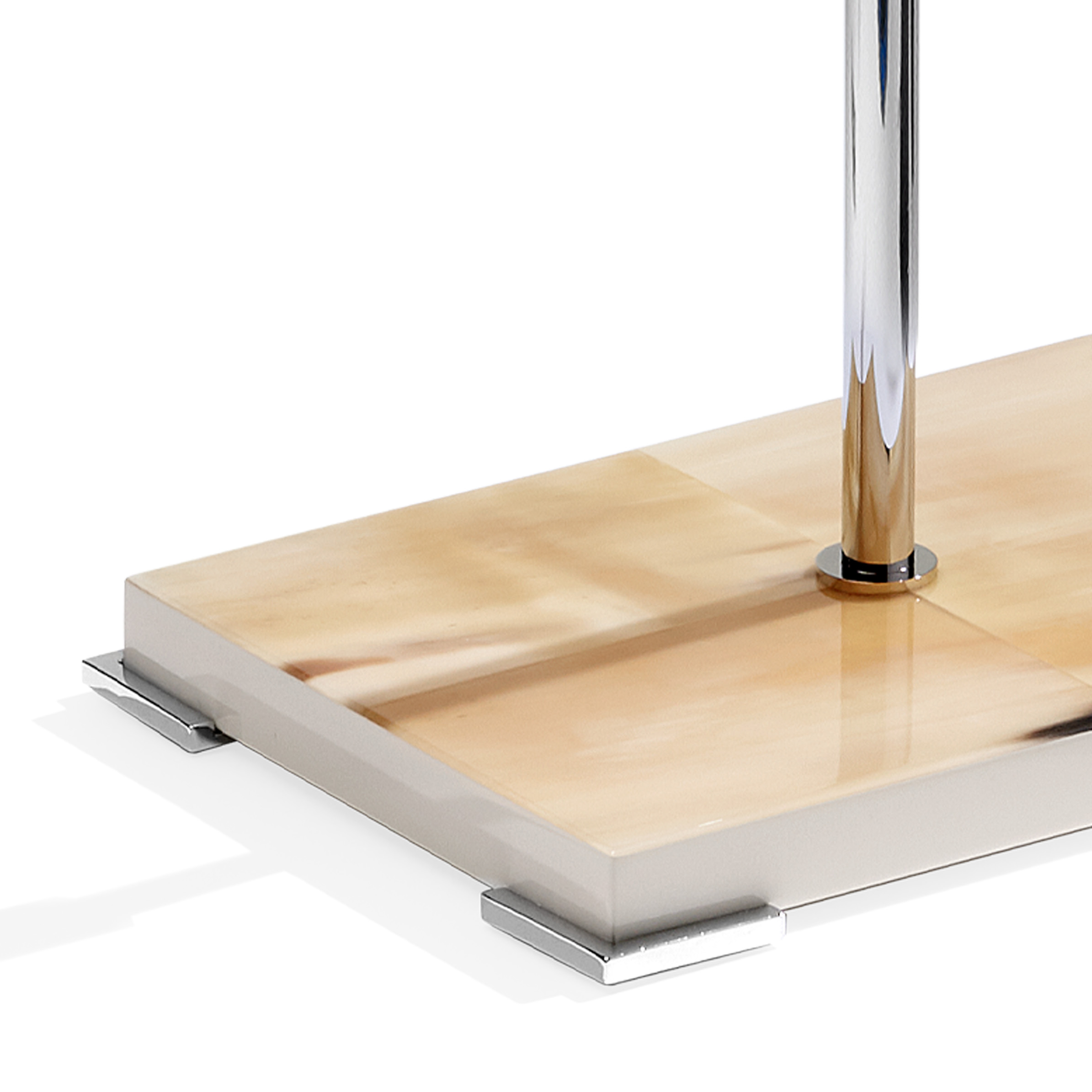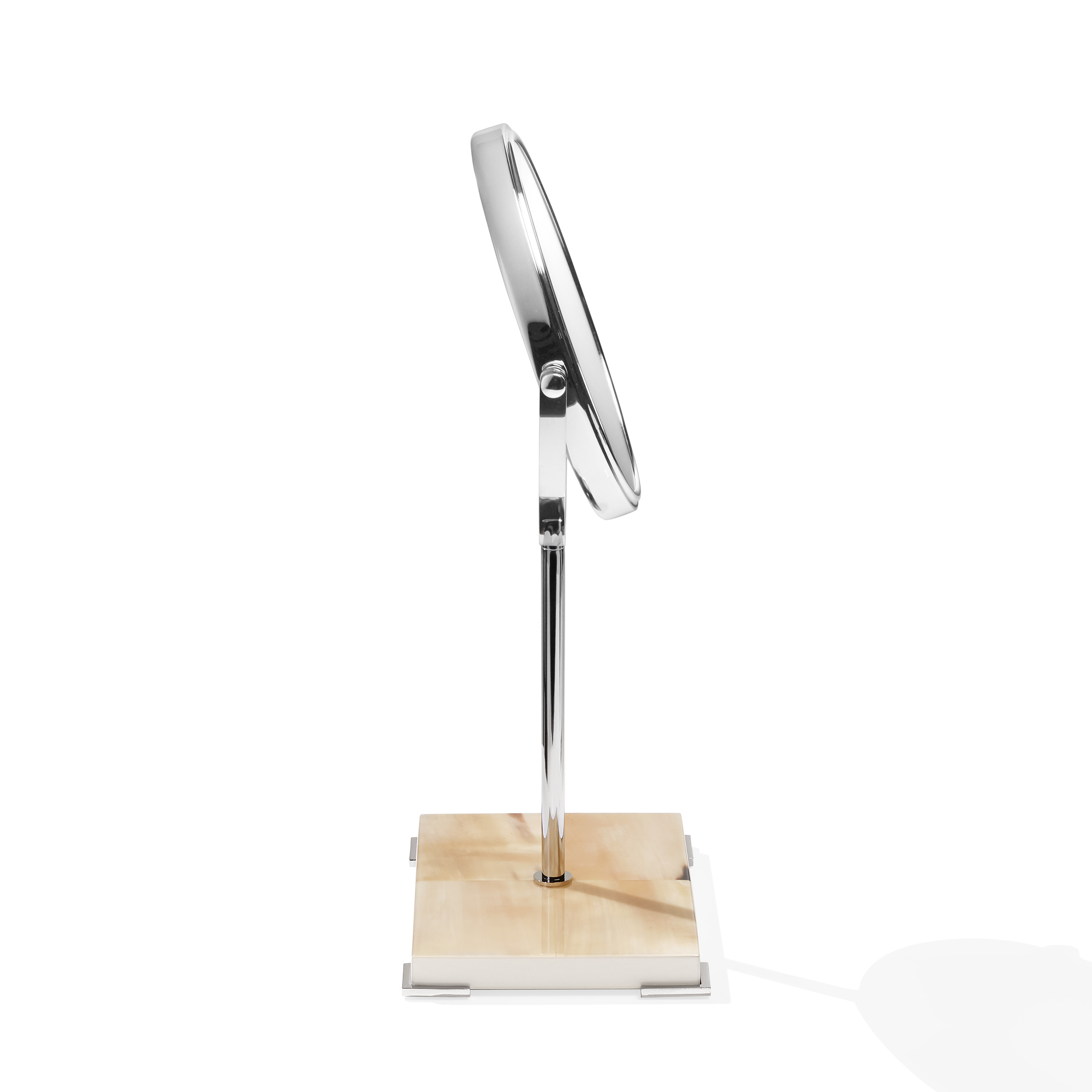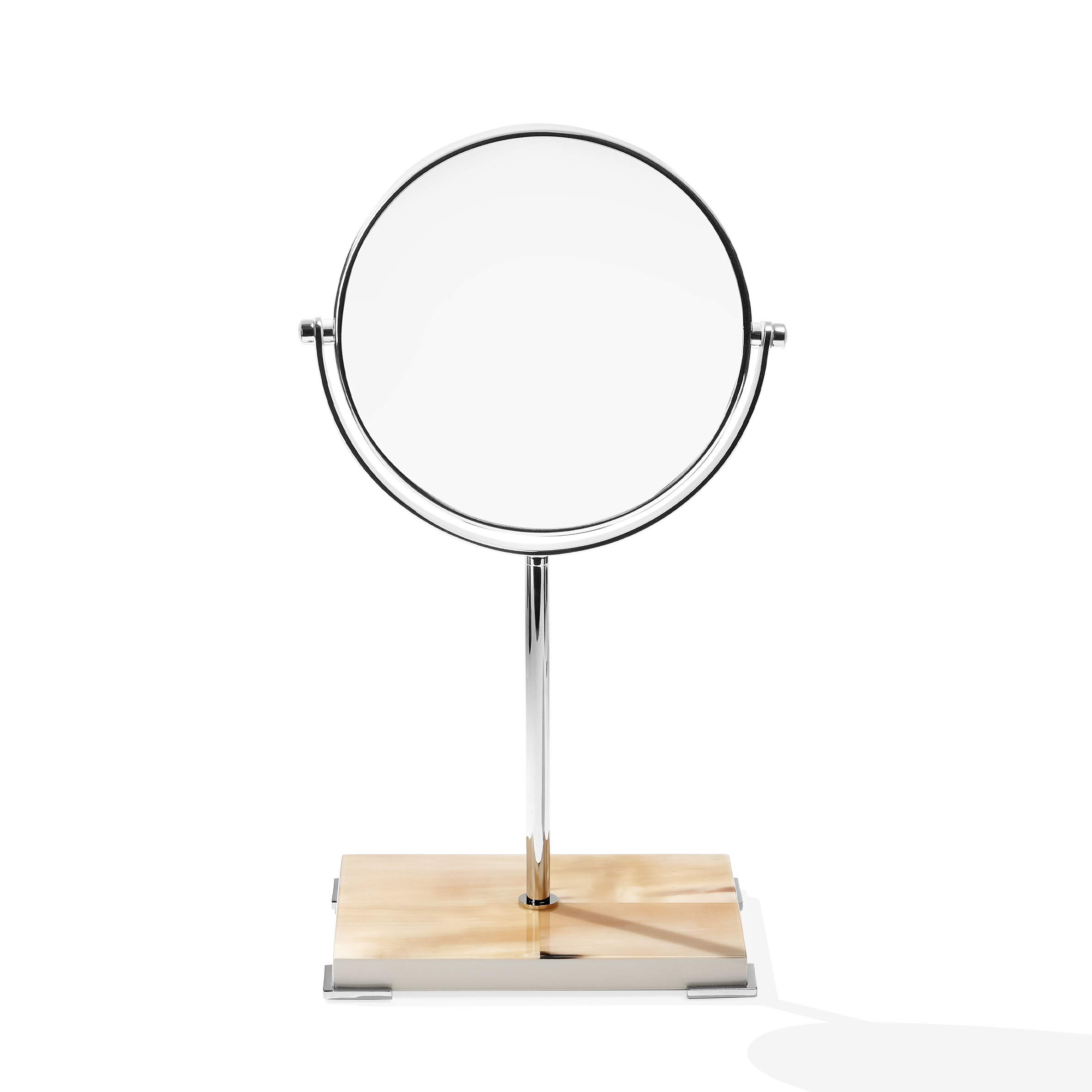 Two sided magnifying make-up mirror with stand in chromed brass. Base in horn and wood with lacquered ivory gloss finish.
