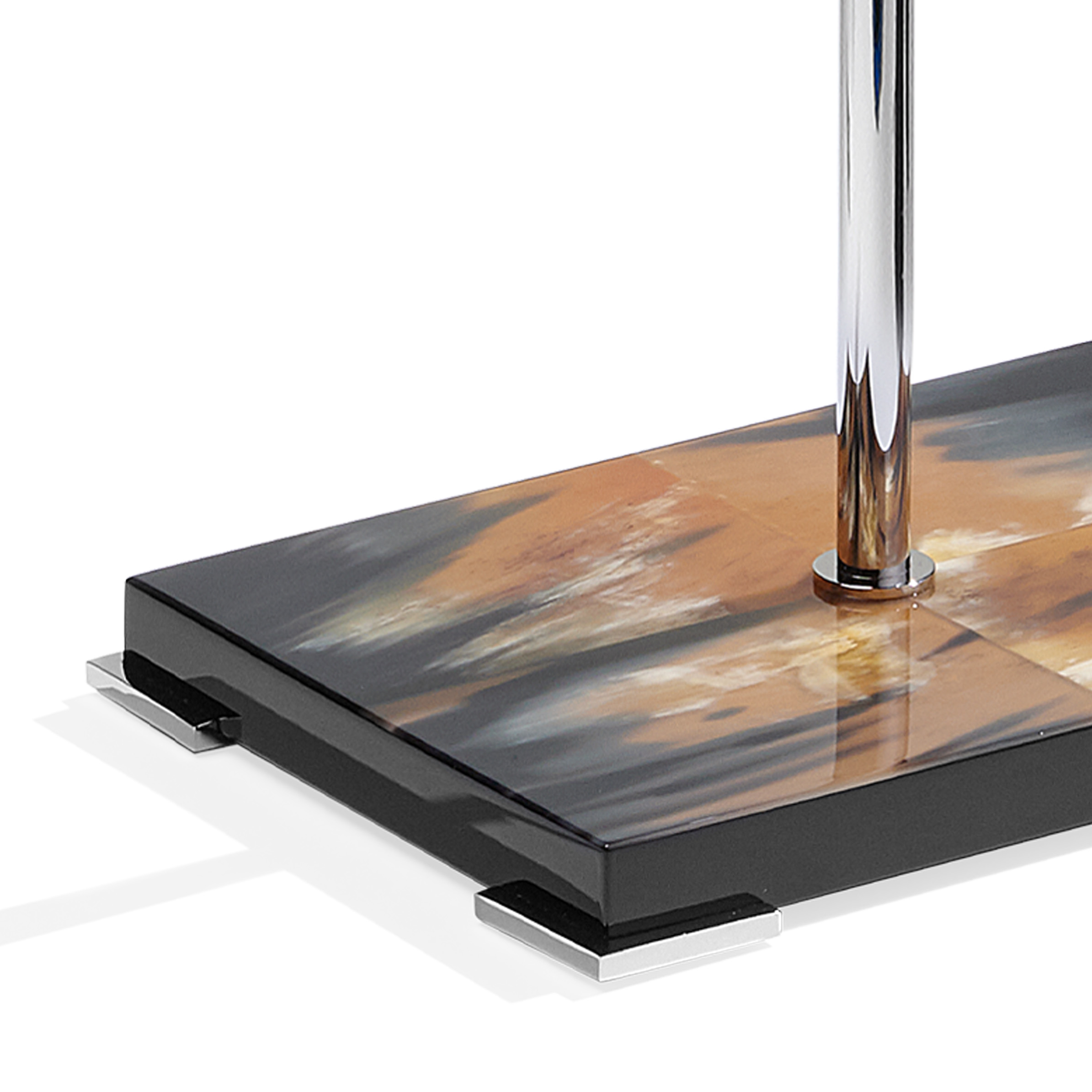 Two sided magnifying make-up mirror with stand in chromed brass. Base in horn and wood with lacquered black gloss finish.