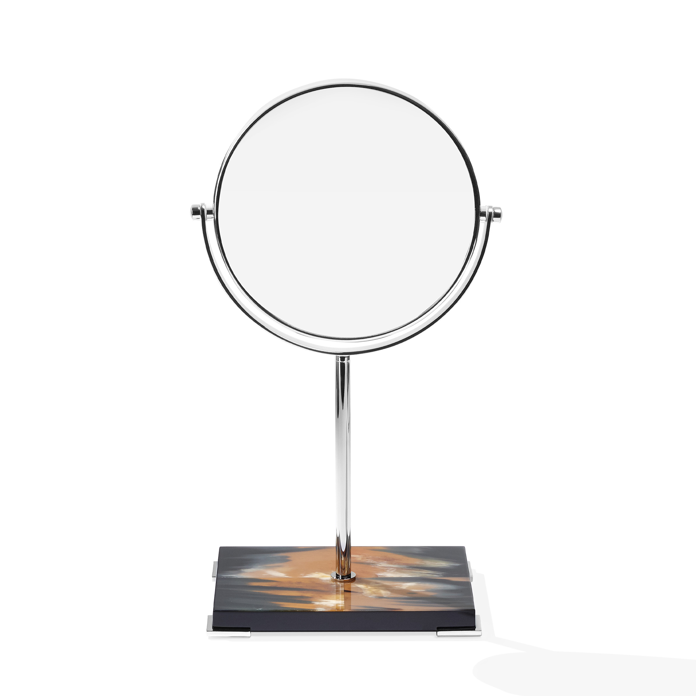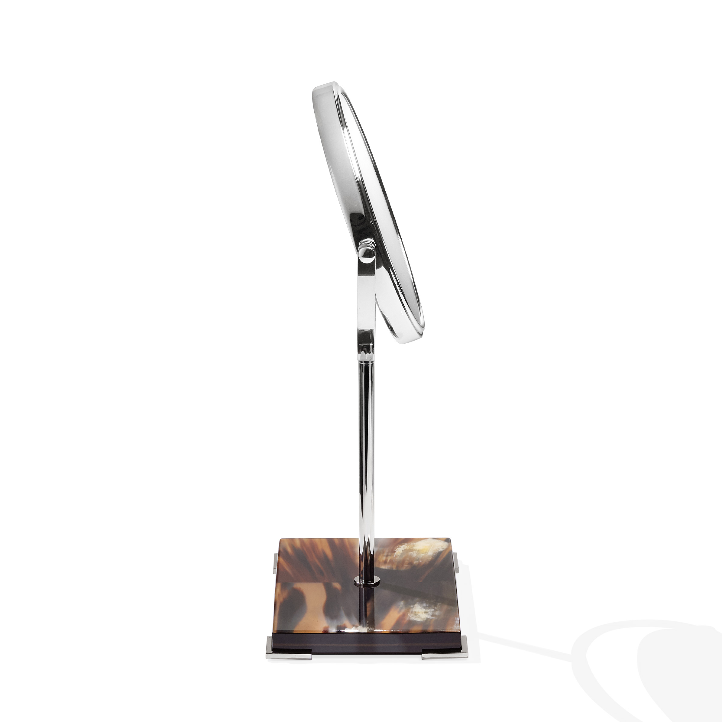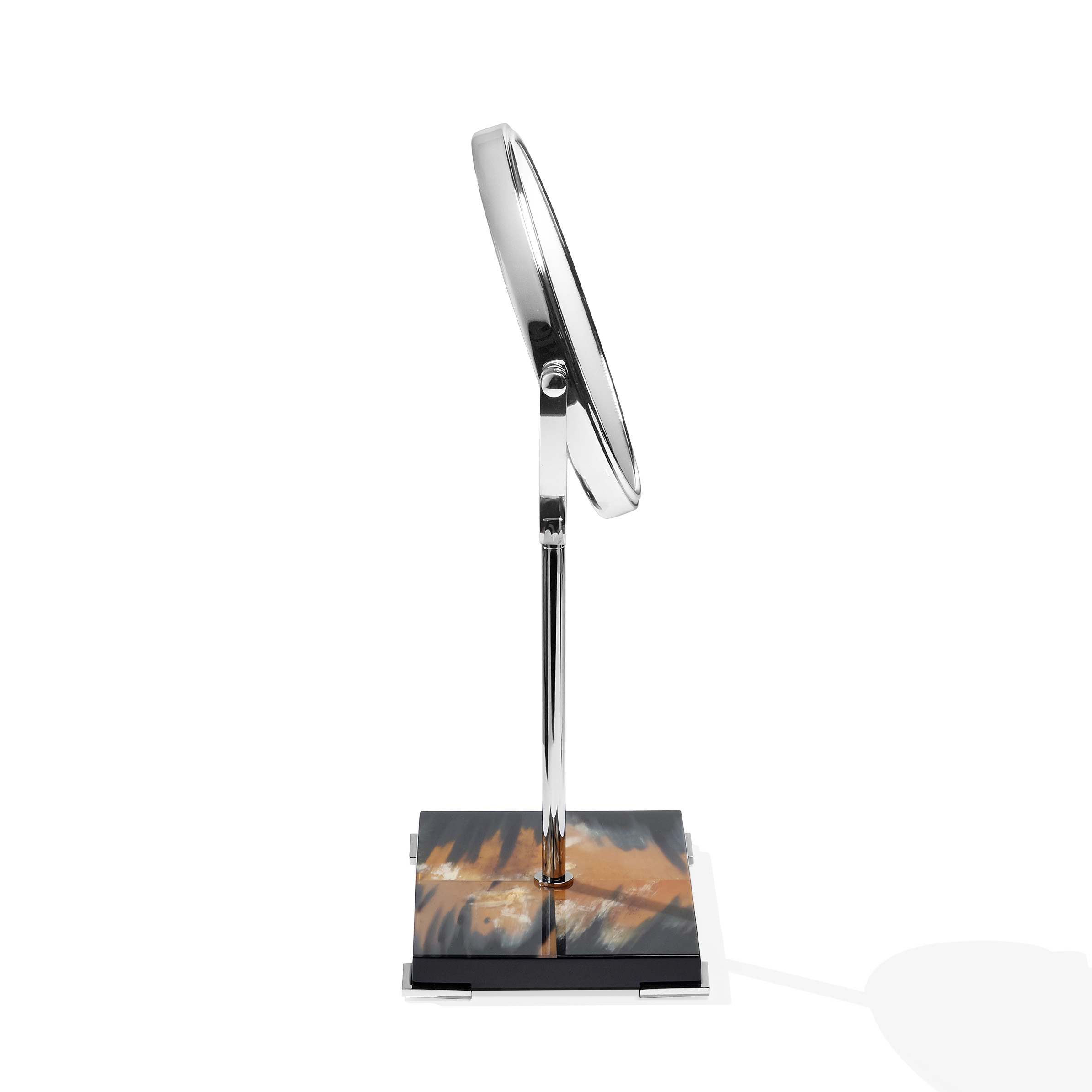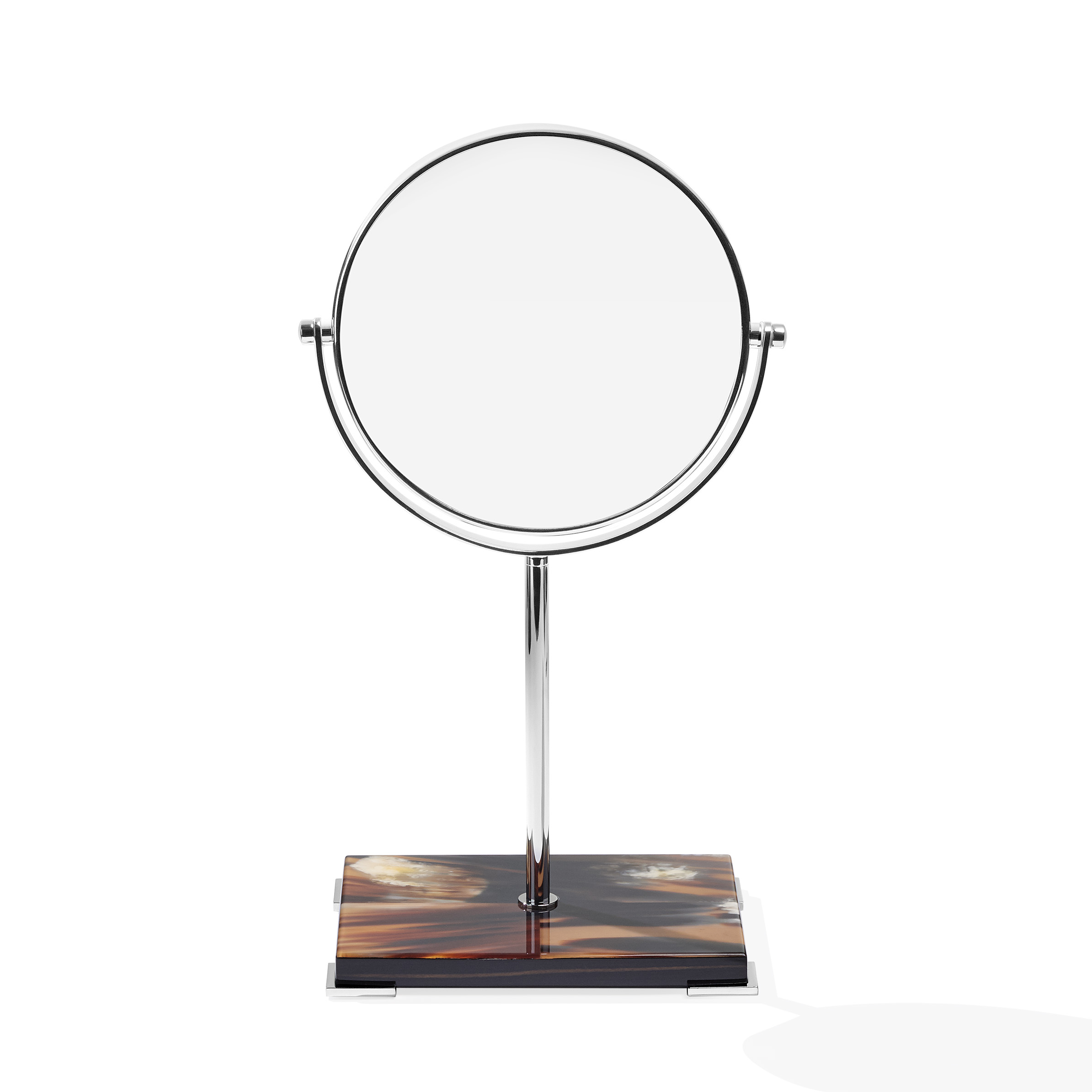 Two sided magnifying make-up mirror with stand in chromed brass. Base in horn and glossy ebony.