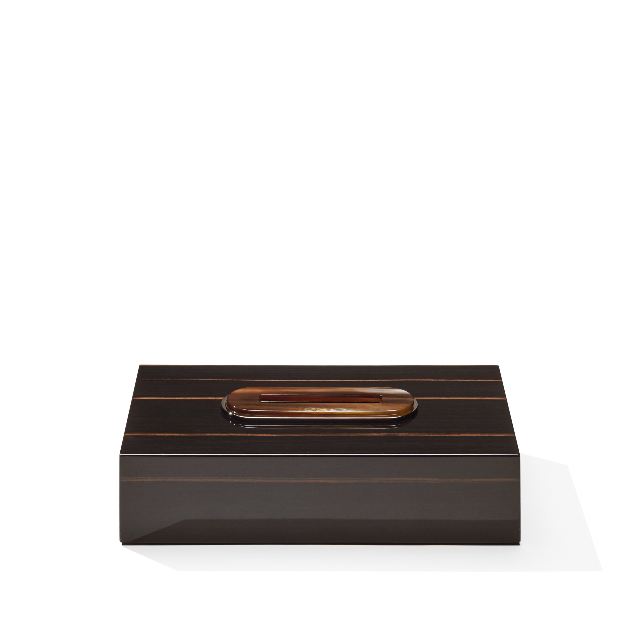 Elevate the decor of your bathroom, bedroom, or office with our Veletta tissue box holder. Combining style and functionality, Veletta is made of glossy ebony veneer, and it’s decorated by an elegant detail in natural horn and chromed brass. The warm tones of horn and ebony are skillfully matched together to elevate an everyday item into a sophisticated decorative piece. The careful selection and processing of materials highlight the unique aesthetic of Veletta that will effortlessly enhance both domestic and professional spaces