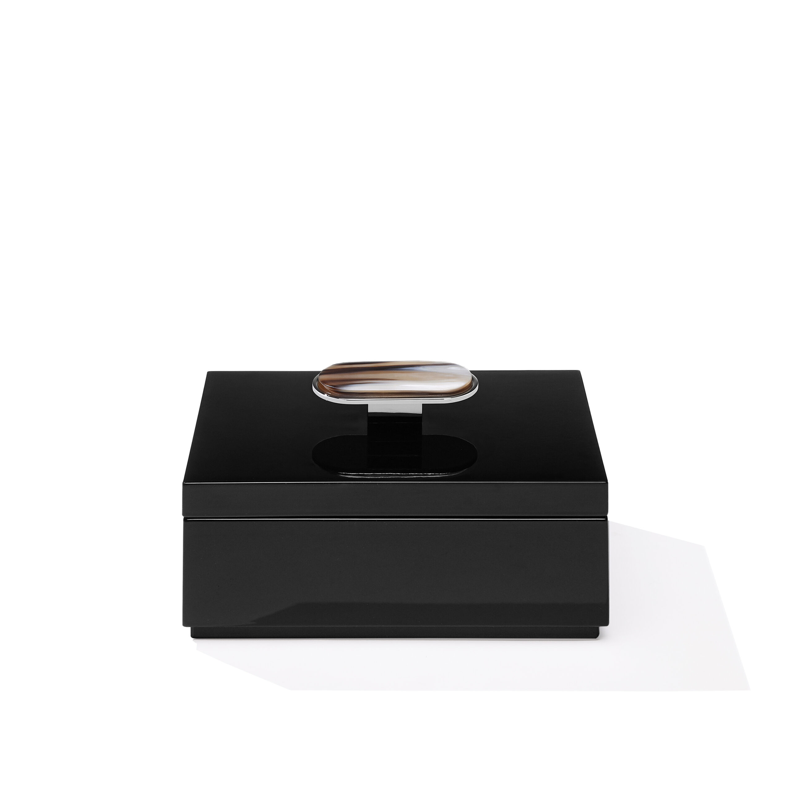 Square box in wood with lacquered black gloss finish. Lid in wood with lacquered black gloss finish with handle in horn and chromed brass.