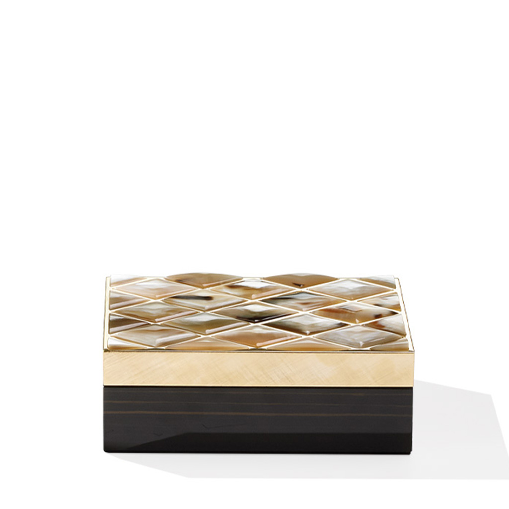 Box in glossy ebony. Lid in hand engraved 24K gold plated brass with raised rounded horn inlays.