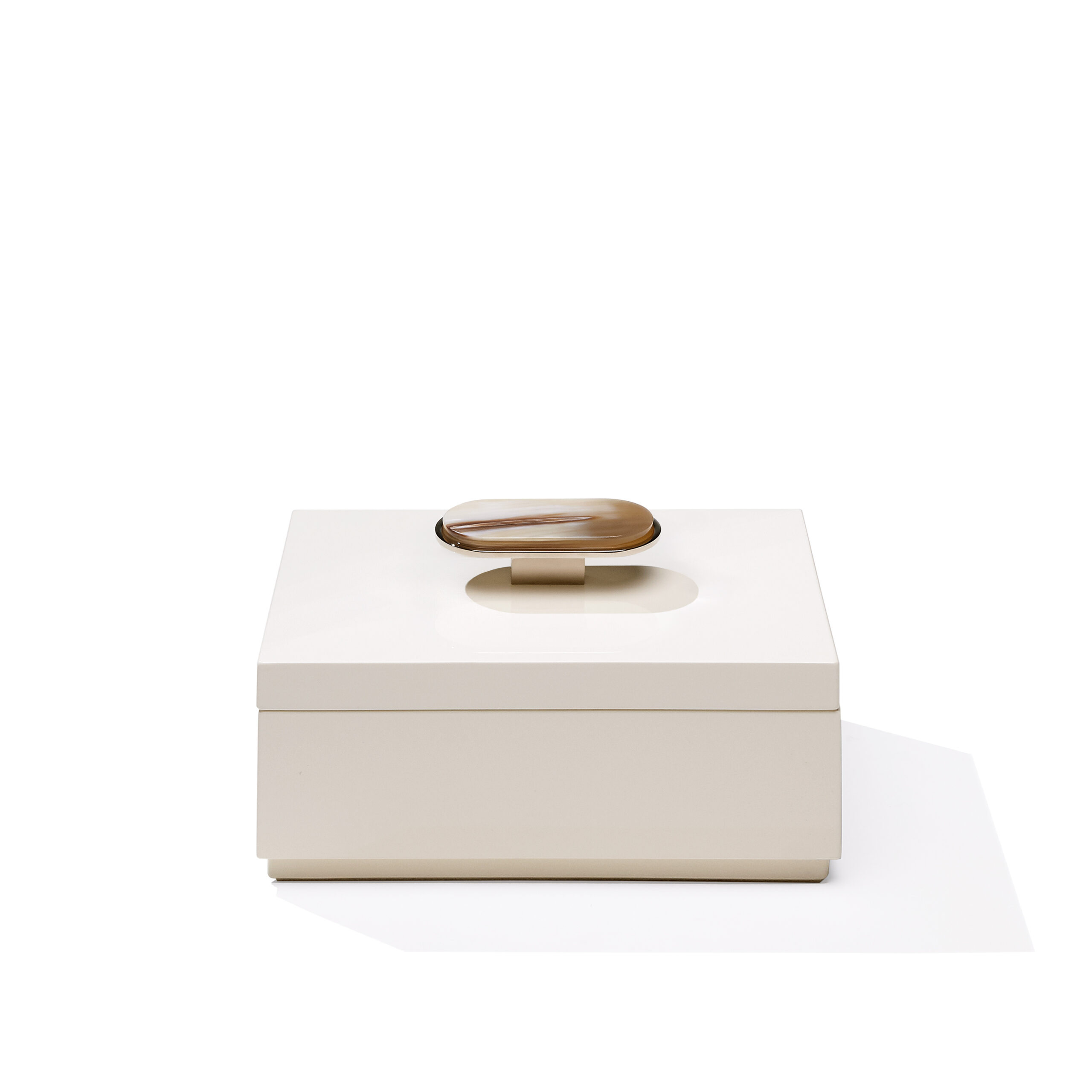 Square box in wood with lacquered ivory gloss finish. Lid in wood with lacquered ivory gloss finish with handle in horn and chromed brass.