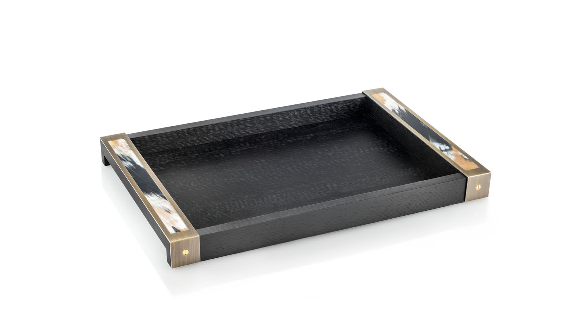 Tray in black oak veneer. Details in matte horn and burnished brass with exposed screws in 24k gold plated brass.