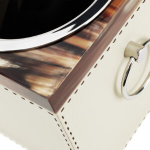 Un’aggiunta elegante all’angolo bar, il secchiello ghiaccio Nives è un must-have per gli amanti dei drinks on the rocks. Il design si distingue per i raffinati dettagli in corno naturale e per le cuciture punto sellaio, realizzate a mano, che sono presenti lungo tutti i lati.