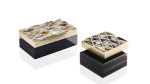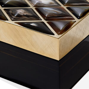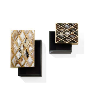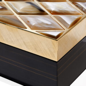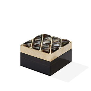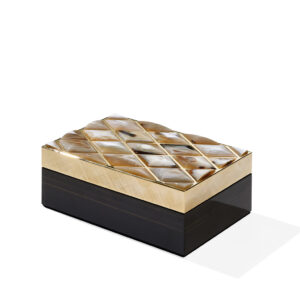 Progettata per riporre bijoux o piccoli accessori, la scatola Fedora è perfetta per mantenere in ordine gli oggetti più preziosi. Realizzata in ebano glossy, il design si contraddistingue per l’elegante coperchio in ottone bulinato placcato oro 24k con splendidi inserti in corno sagomato a mano. Dettagli ricercati che testimoniano l’eccellenza artigianale e il saper fare specifico tramandato dalla tradizione.