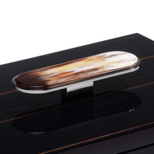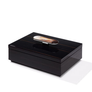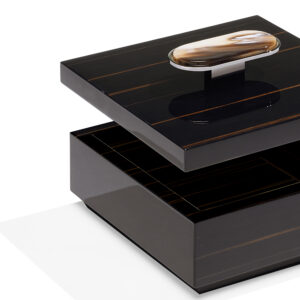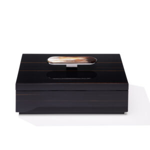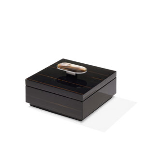 La scatola Priora è progettata per riporre e custodire con cura piccoli oggetti. Realizzata in ebano glossy, Priora è contraddistinta da un’elegante applicazione in corno e ottone cromato che decora il coperchio. Le sfumature esclusive del corno conferiscono un tocco di autenticità e bellezza naturale che rende ogni scatola un pezzo unico. Disponibile sia nella versione quadrata che rettangolare, la scatola Priora si presenta come un accessorio dal gusto raffinato, perfetto come regalo o per impreziosire gli ambienti più esclusivi.