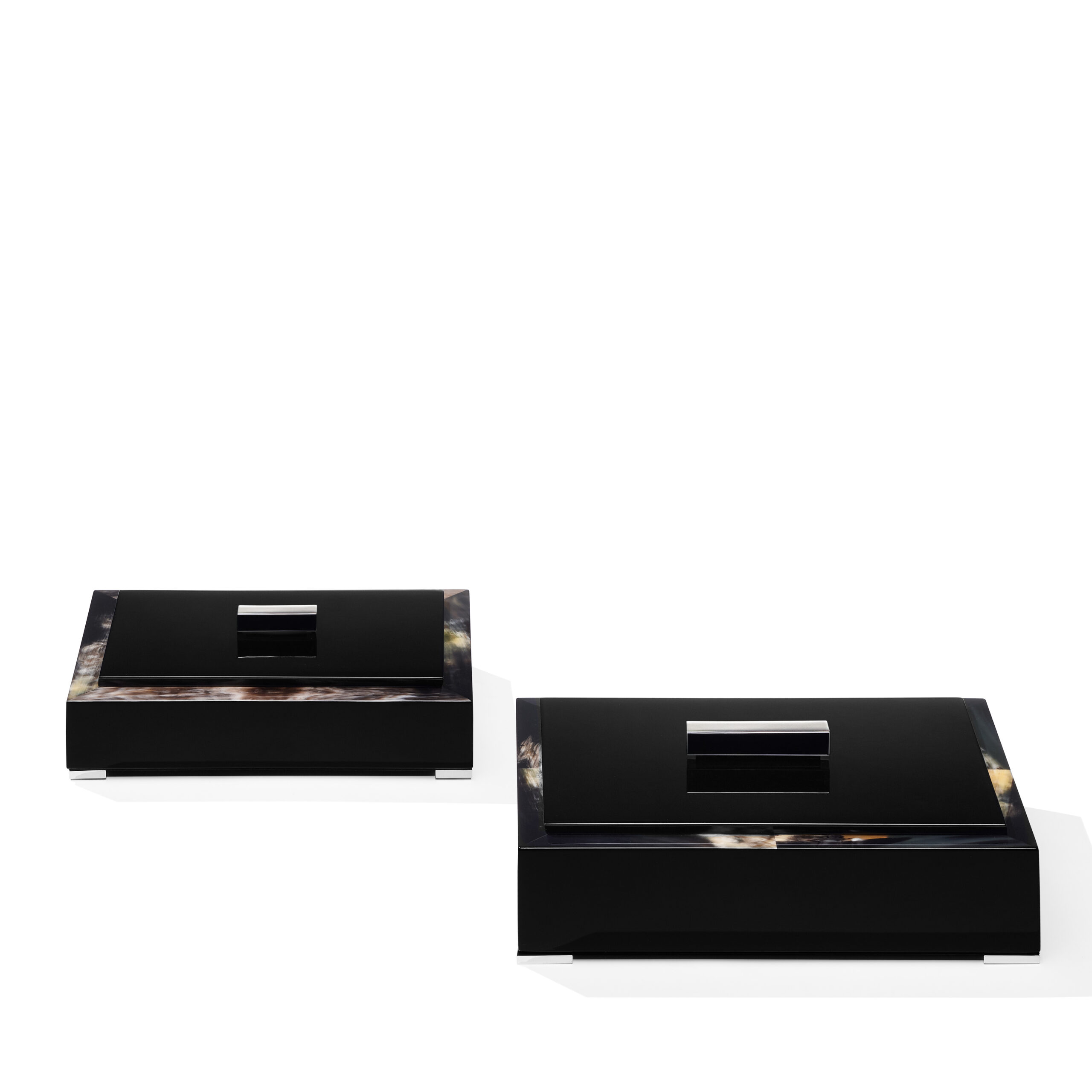 Scatola rettangolare in corno scuro e legno laccato lucido colore nero. Top in legno laccato lucido colore nero con applicazione in ottone cromato. Interno in pelle Tosca (cat. Super), colore nero. Piedini in ottone cromato.