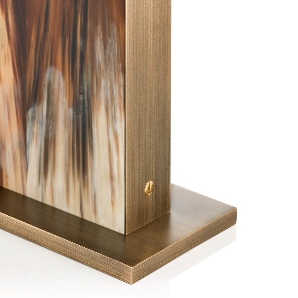 Progettata per illuminare gli ambienti più raffinati e creare la giusta atmosfera, la lampada da tavolo Florian è un accostamento equilibrato di materiali e textures dal fascino intramontabile. Il design poggia su una base rettangolare in ottone brunito e si contraddistingue per il corpo realizzato a mano in corno naturale, con finitura opaca. Un profilo in ottone brunito decorato con viti a vista in ottone placcato oro 24k aggiunge un tocco industriale alla lampada. Proposta con un raffinato paralume in shantung avorio, decorato con un bordo in pelle Tosca color testa di moro, Florian è la soluzione perfetta per essere inserita nei più prestigiosi progetti residenziali o di hospitality.