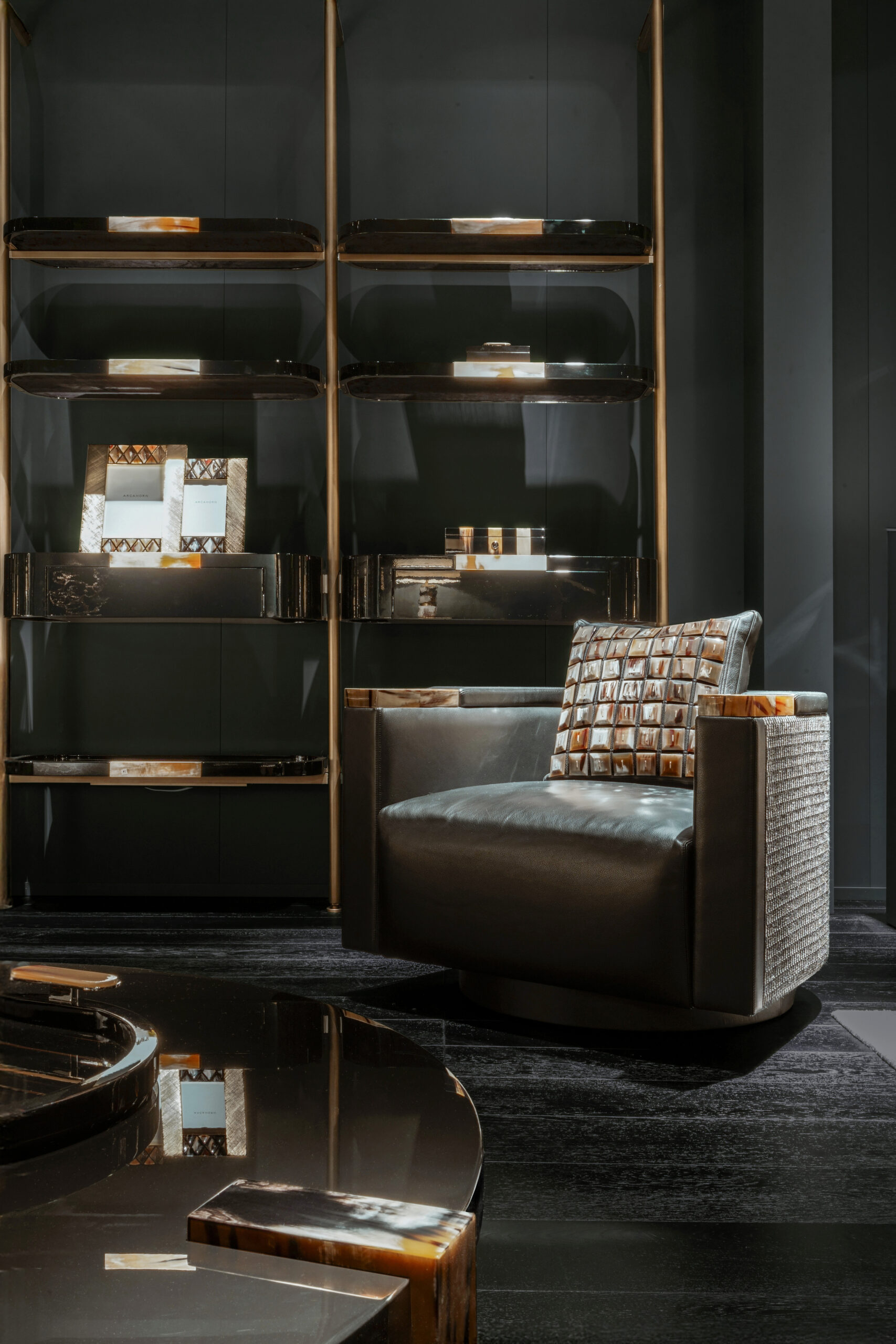 Elementi distintivi e di grande pregio sono gli inserti in corno naturale, applicati con maestria a ogni ripiano. Le sfumature uniche e vibranti del corno creano un raffinato contrasto materico, che dialoga con la sobrietà del legno laccato e del metallo brunito. Neria è un sistema espositivo pensato per valorizzare libri, oggetti d’arte e accessori, con uno spirito contemporaneo e un’eleganza senza tempo.