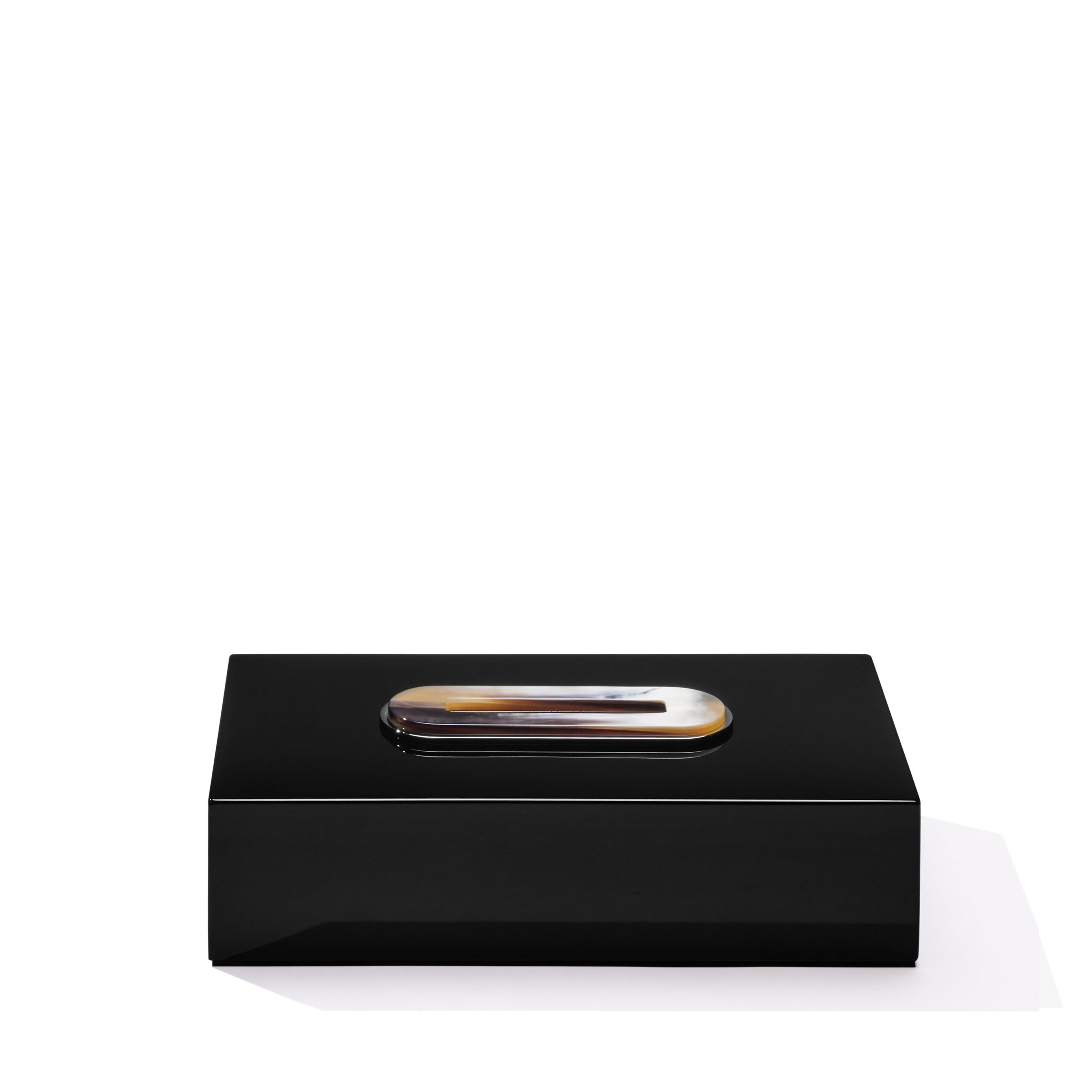 Portakleenex in legno laccato lucido colore nero con applicazione in corno e ottone cromato.